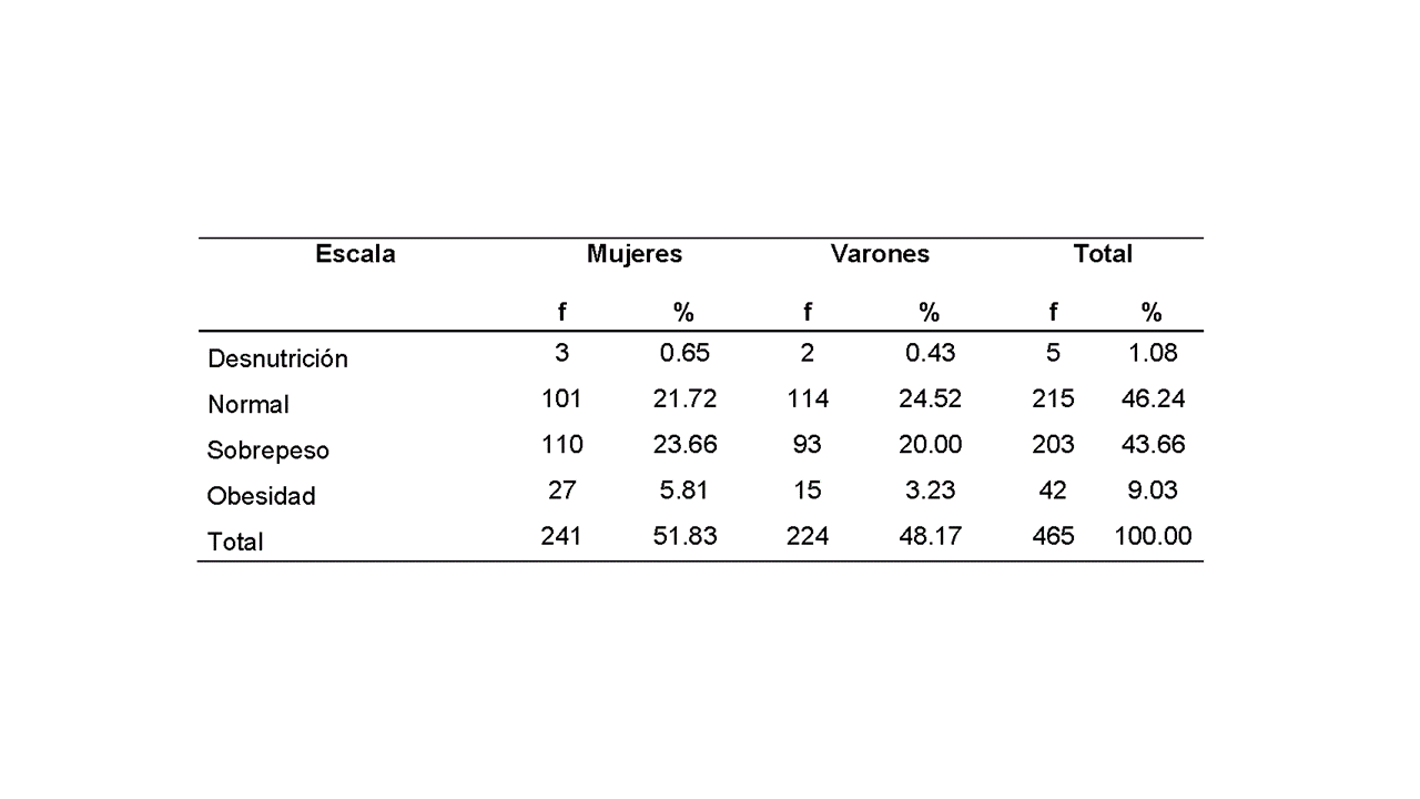 En la Tabla 6, las mujeres tienen una prevalencia a la obesidad y al sobrepeso 5.81% y 23.66%, respectivamente; a diferencia de los varones, con 3.23% y 20.00%, respectivamente. Los varones preponderan en la escala normal 24.52%, en contraste con las mujeres 21.72% y, en la escala desnutrición, las mujeres prevalecen 0.65% en diferencia con los varones 0.43%