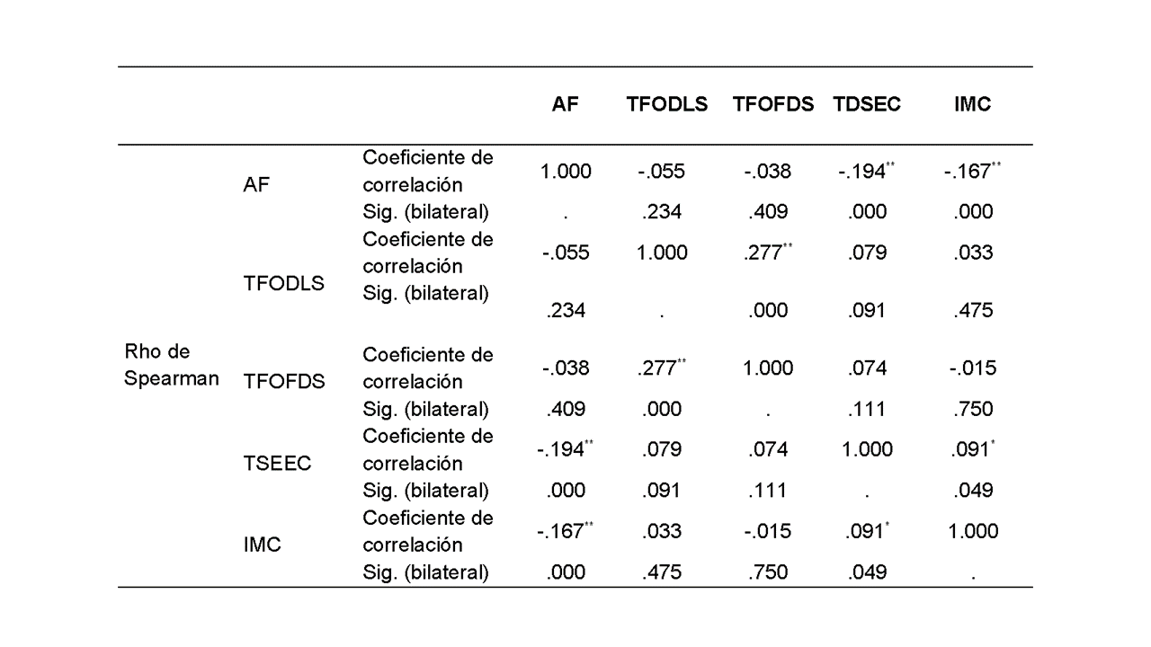 Según la correlación Rho de Spearman entre las variables actividad física y el tiempo frente al ordenador durante la semana, en adolescentes en pandemia con una confianza del 95%, la correlación es inversamente proporcional de negativa moderada de -0.055 y p > .05. En la asociación de la actividad física y el tiempo frente al ordenador en un fin de semana, la correlación es inversamente proporcional de negativa baja de -0.038 y p > .05. La relación entre la actividad física y el tiempo de sueño es inversamente proporcional negativa baja de -0.194 y p < .01. En la asociación entre la actividad física y el índice de masa corporal, la correlación es inversamente proporcional de negativa baja de -0.167 y p < .01. Se pudo determinar que, a menor actividad física en tiempos de pandemia, el tiempo de sueño varia y el IMC se incrementa.