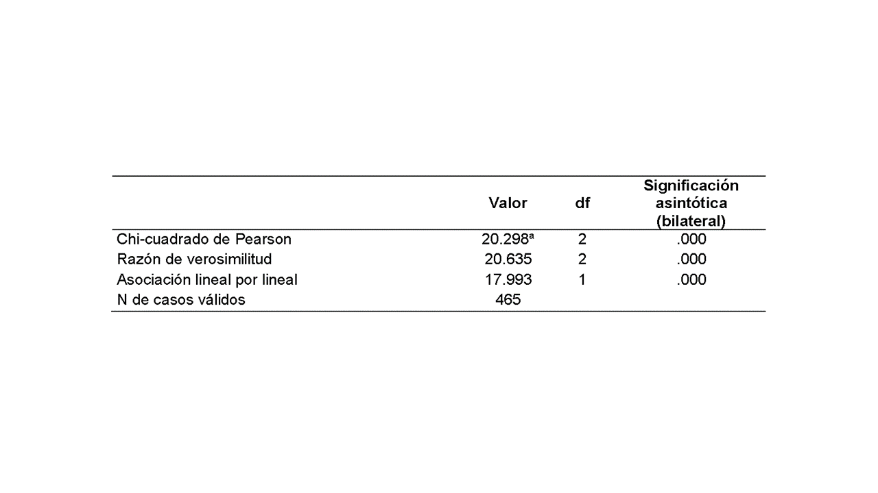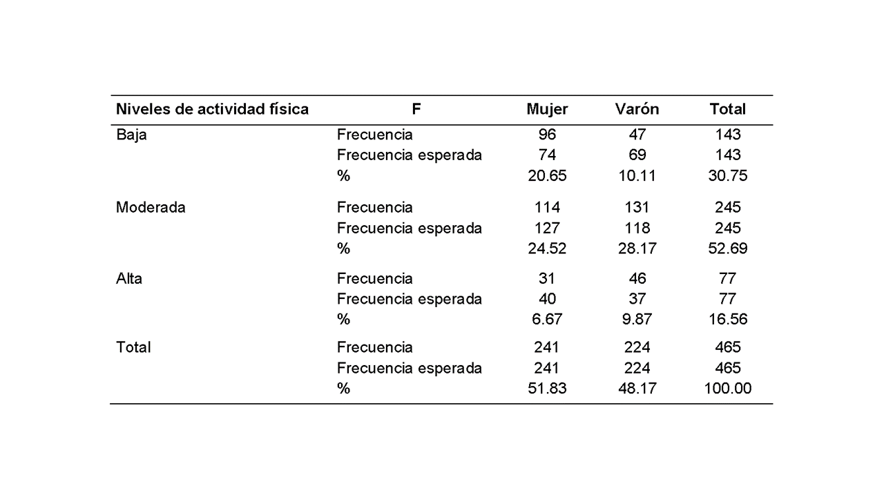 En la Tabla 1, el 20.65% de mujeres se ubica en la escala de actividad física baja, en comparación con los varones 10.11%; los varones muestran mayor nivel de actividades de alta intensidad y moderada 9.89% y 28.17%, en contraste con las mujeres 6.67% y 24.52%, respectivamente. En la prueba de Chi-cuadrado, la frecuencia observada es diferente a la frecuencia esperada en los tres niveles de actividad física (baja, moderada y alta), determinándose un Chi-cuadrado de Pearson < .001.