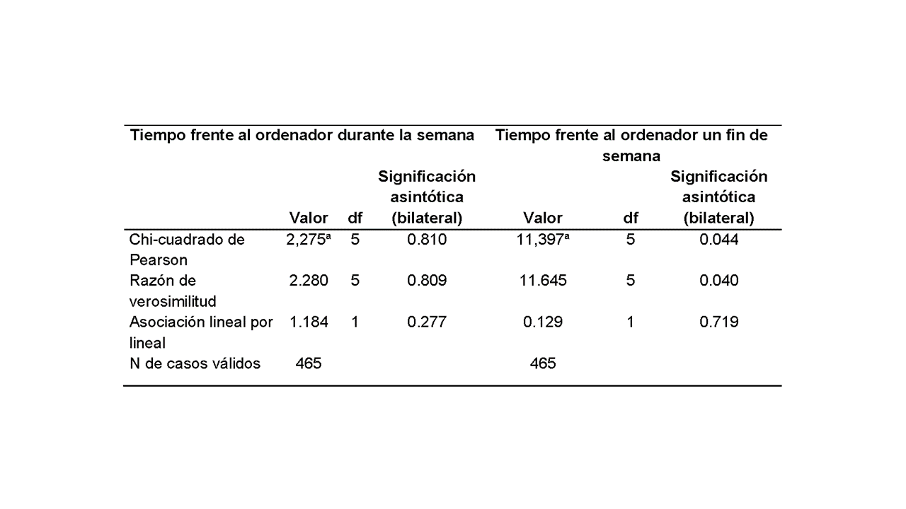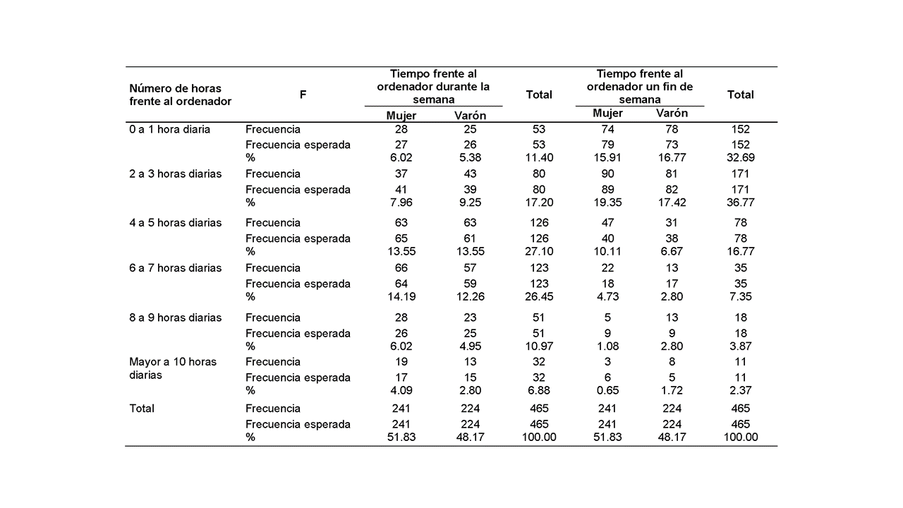 En la Tabla 3, las mujeres tienen mayor tendencia de permanecer frente a la pantalla de un ordenador durante la semana; el 4.09% permanece más de 10 horas diarias, el 6.02% está de 8 a 9 horas y el 14.19% se ubica de 6 a 7 horas diarias. En contraste con los varones, 2.80% está más de 10 horas; el 4.95%, de 8 a 9 horas; y el 12.26%, de 6 a 7 horas diarias. Los varones permanecen más tiempo el fin de semana: el 1.72% permanece más de 10 horas; 2.80%, de 8 a 9 horas; otro 2.80% de 6 a 7 horas; el 6.67%, de 4 a 5 horas y el 17.42% de 2 a 3 horas. En comparación con las mujeres, donde el 0.65% permanece más de 10 horas; el 1.08%, de 8 a 9 horas; el 4.73%, de 6 a 7 horas; el 10.11%, de 4 a 5 horas; y el 19.35%, de 2 a 3 horas en un fin de semana. En la prueba de Chi-cuadrado las frecuencias observadas son diferentes a las frecuencias esperadas en el tiempo frente a la pantalla durante la semana y el fin de semana, estableciéndose un Chi-cuadrado de p > .05 y p < .05.