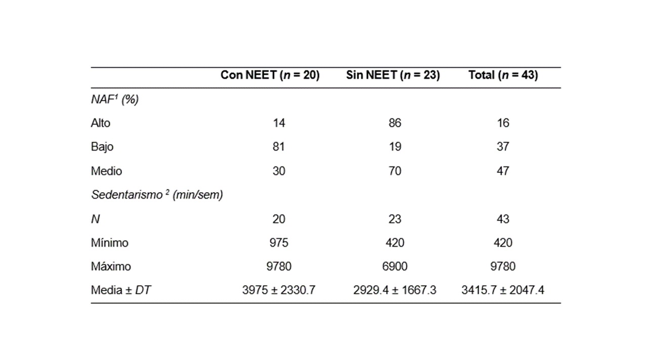En la Tabla 1 se presentan los resultados obtenidos para la variable de nivel de actividad física, en la cual se puede observar que los y las adolescentes sin NEET, en general, presentan un mejor nivel de actividad física que aquellos con NEET. La mayoría de los y las adolescentes sin NEET obtuvieron un NAF medio, mientras que aquellos con NEET mostraron mayormente un bajo NAF. Además, para la categoría “Alto” el mayor porcentaje fue observado en los y las adolescentes sin NEET. Estas diferencias fueron estadísticamente significativas (.05).