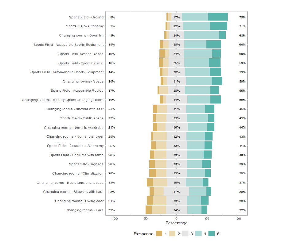 The first objective of our research was primarily descriptive. Due to that, we began by characterizing the sample in terms of age (mean and standard deviation) and the frequencies of gender, disability, competitive level, and AHSN. Then, we proceeded to a characterization of the survey response profile. For this, graphs were generated indicating the percentages per Likert score of responses obtained in each item. Items were graphically ordered from those with the best perception to those with the worst perception and then grouped for a better understanding of where the domains of transportation, location, sports field, parking lots and bathrooms, and changing rooms met. The process was done through the Content Validity Coefficient (CVC) methodology which, according to Hernández-Nieto, allows for assessing the degree of agreement of the experts regarding each of the items and the instrument in general (Pedrosa et al., 2013).