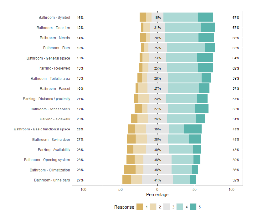 Regarding bathrooms, most of them scored a perception of adequate accessibility, highlighting the internal spaces at 67%, their accessories, and the use of space at 66%. Regarding parking, we can see similar behaviour, highlighting the reserved use at 62%, but with a decrease in trend to 43% (Figure 2).