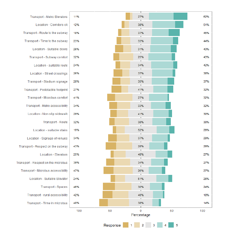 Regarding the development and validation of the questionnaire, it is observed that there is a validation coefficient of 0.96, which is excellent (Pedrosa et al., 2013), making it a good quality questionnaire and a relevant instrument that can provide valuable information when making decisions about accessibility, which in the process of conducting a scientific investigation takes on great relevance compared to the measurement of variables that require valid and reliable instruments (Villavicencio Caparó, 2018; Boparai et al., 2019). From the technical point of view, Parapan American games are aligned with the development needs that fully comply with the safeguarding and respecting dignity, functionality, and equity of their participants as a premise for such type of mega-events (Pappous & Brown, 2018).