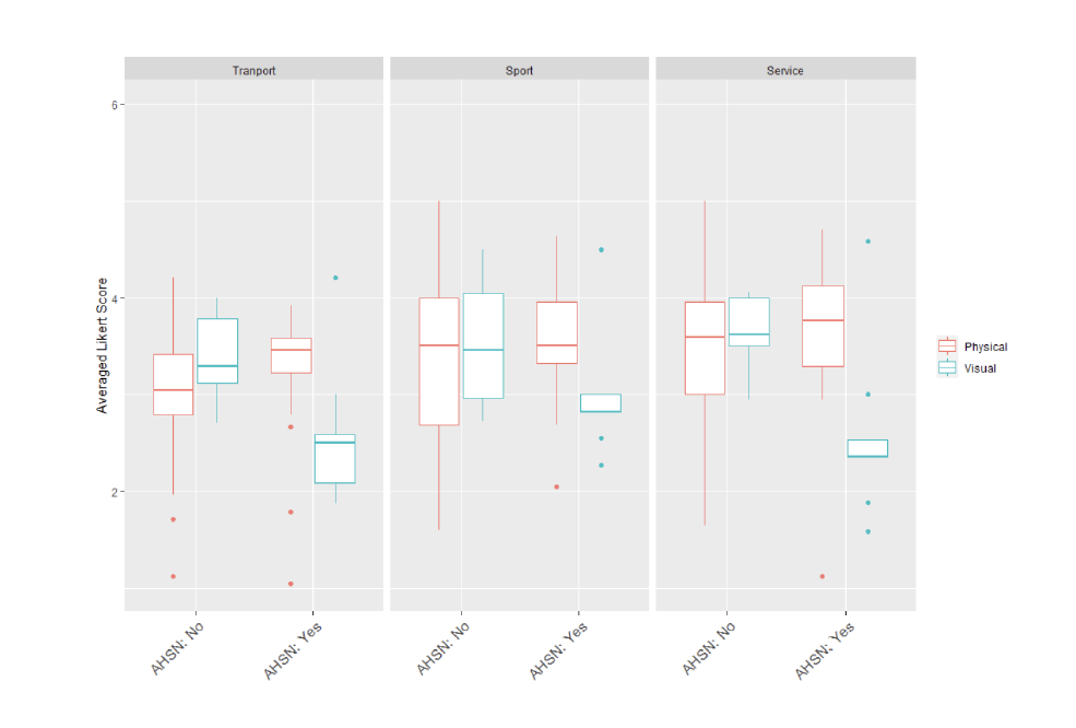 Regarding our second objective, for “Transportation”, AHSN and Disability did not present significant results (AHSN: F (1,101) = 0.54, p = 0.46; Disability: F (1,101) = 2.03, p = 0.15). However, a significant interaction was found (F (1,101) = 14.01, p < 0.001) (Figure 4). The group with AHSN and visual impairment presented a significantly worse perception than the group with physical disability both with AHSN (p = 0.002) and without AHSN (p = 0.027). A significant difference is also shown with the visually impaired group without AHSN (p = 0.004). In other words, there is no significant difference in the perception of para-athletes regarding transportation, except for the para-athletes with visual disabilities and AHSN.