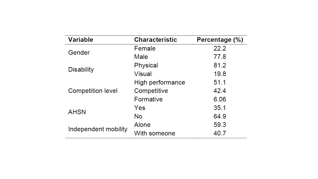The questionnaire was content validated by five experts from the area of inclusion, disability, and physical activity. A validation coefficient = 0.96 was obtained. which represents excellent validity and agreement. Regarding the sample description and the origin of the disability, it can be observed that 81.2% corresponds to physical disability and 19.8% to visual disability, while 35.1% are AHSN, and 51.5% is linked to high competition. It was also found that 59.3% goes on their own to the training sessions, while 40.7% needs to be accompanied. The results are shown in Table 1.