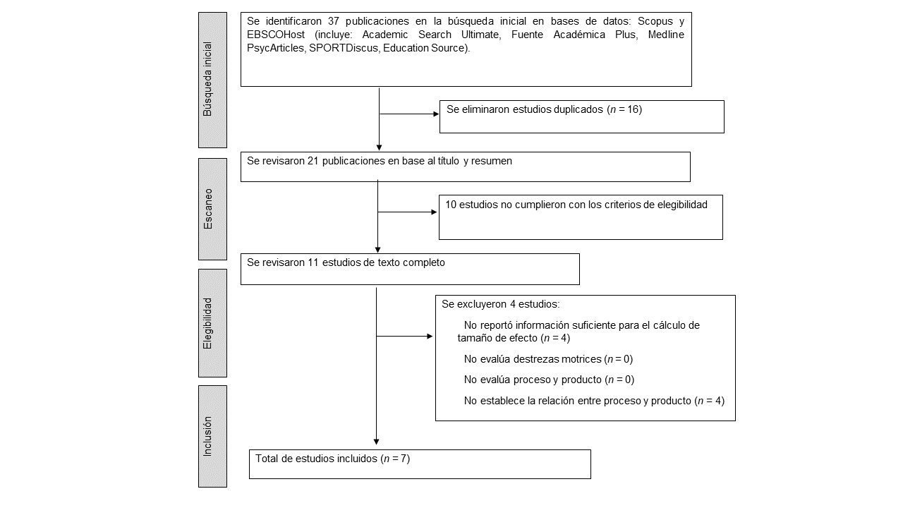 La revisión sistemática de literatura se llevó a cabo por medio de las siguientes bases de datos: EBSCOhost (Academic Search Ultimate, Fuente Académica Plus, Medline PsycArticles, SPORTDiscus, Education Source) y Scopus. La estrategia de búsqueda incluyó los términos booleanos: ("motor skill" OR "motor performance" OR "motor competence") AND ("process-oriented" OR "product-oriented") AND (relationship OR correlation OR association).