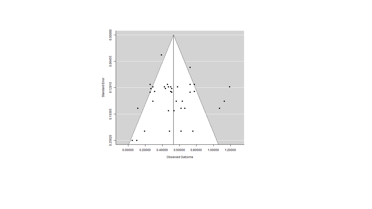 En la Figura 2 se presenta el gráfico de embudo, donde no se visualiza asimetría; los resultados de la prueba de Egger confirman la simetría (t = 0.677; p = .502, B = 0.45). Lo anterior indica que no se detectó sesgo, por lo que se concluye que se incluyeron en el presente trabajo los estudios representativos del área.