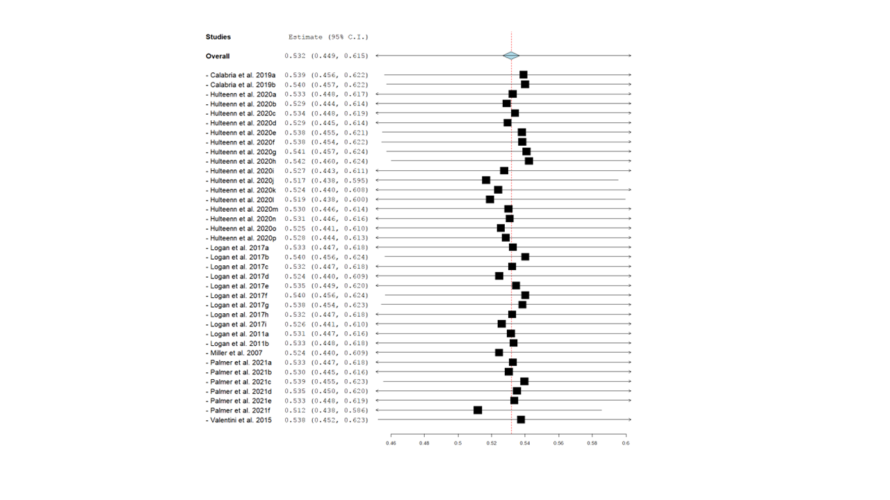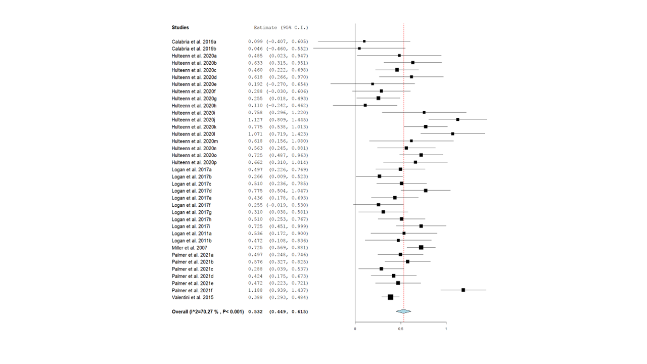 Se encontró una relación positiva y significativa en el TE global (TE = 0.532; IC95% = 0.449,0.615; p < .001; n = 37; Q = 115.19; p < .001; I2 = 70.26%), lo que indica que el desempeño de destrezas motrices evaluado por medio del proceso está relacionado con la evaluación por medio del producto (Figura 4).