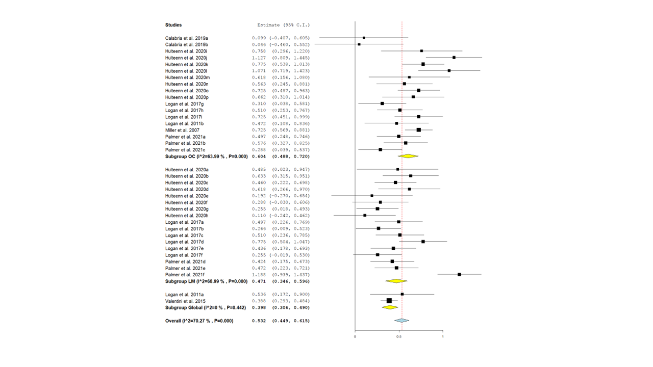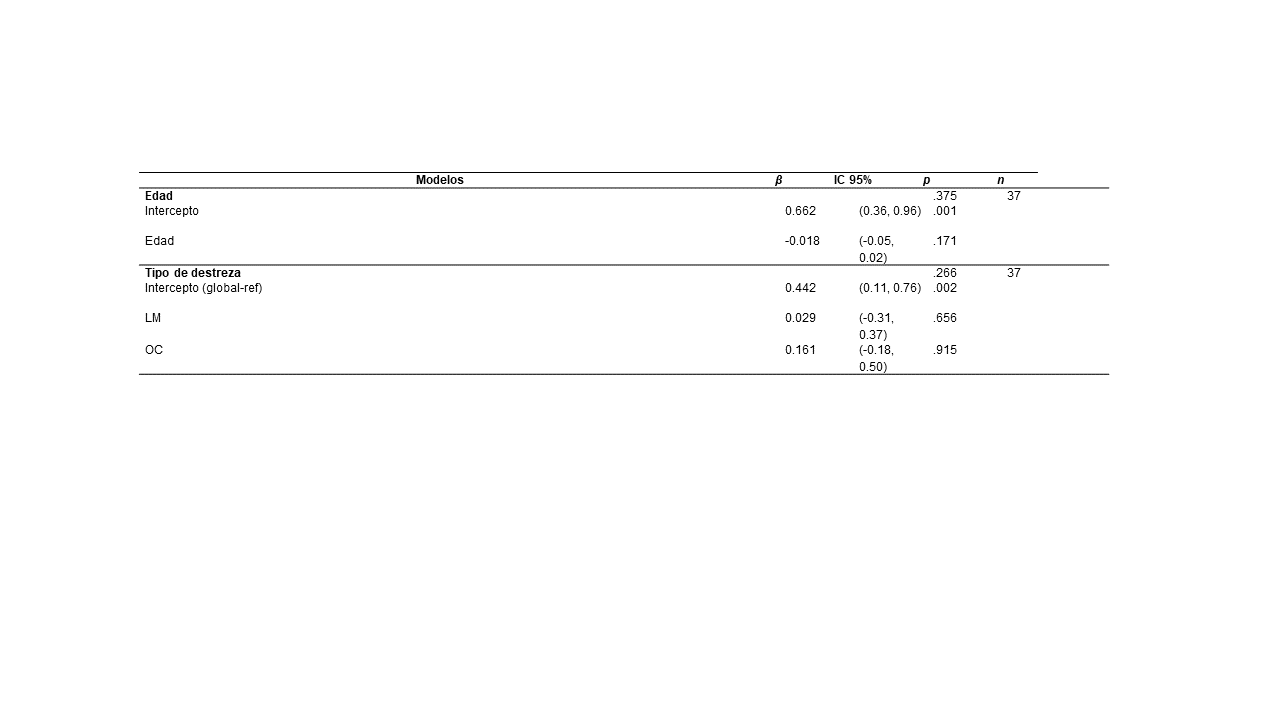 El análisis de subgrupo indicó un tamaño de efecto significativo para las tres categorías (Figura 5), LM (TE = 0.471; IC95% = 0.346,0.596; p < .001; n = 17); OC (TE = 0.604; IC95% = 0.488,0.720; p < .001; n = 18) y global (TE = 0.398; IC95% = 0.306,0.490; p < 0.001; n = 2). Además, en los análisis de metarregresión se encontró que ni el tipo de destreza y la edad, ni la interacción entre ambas, influyen en el TE (Tabla 4).