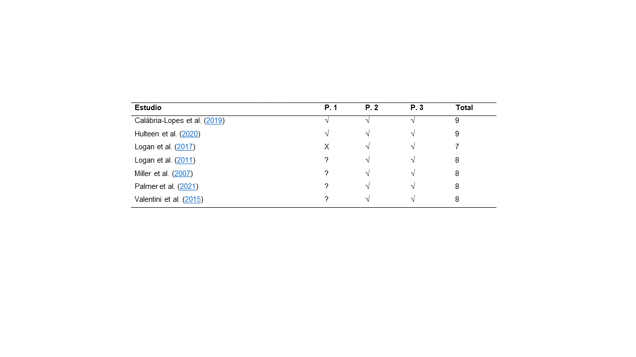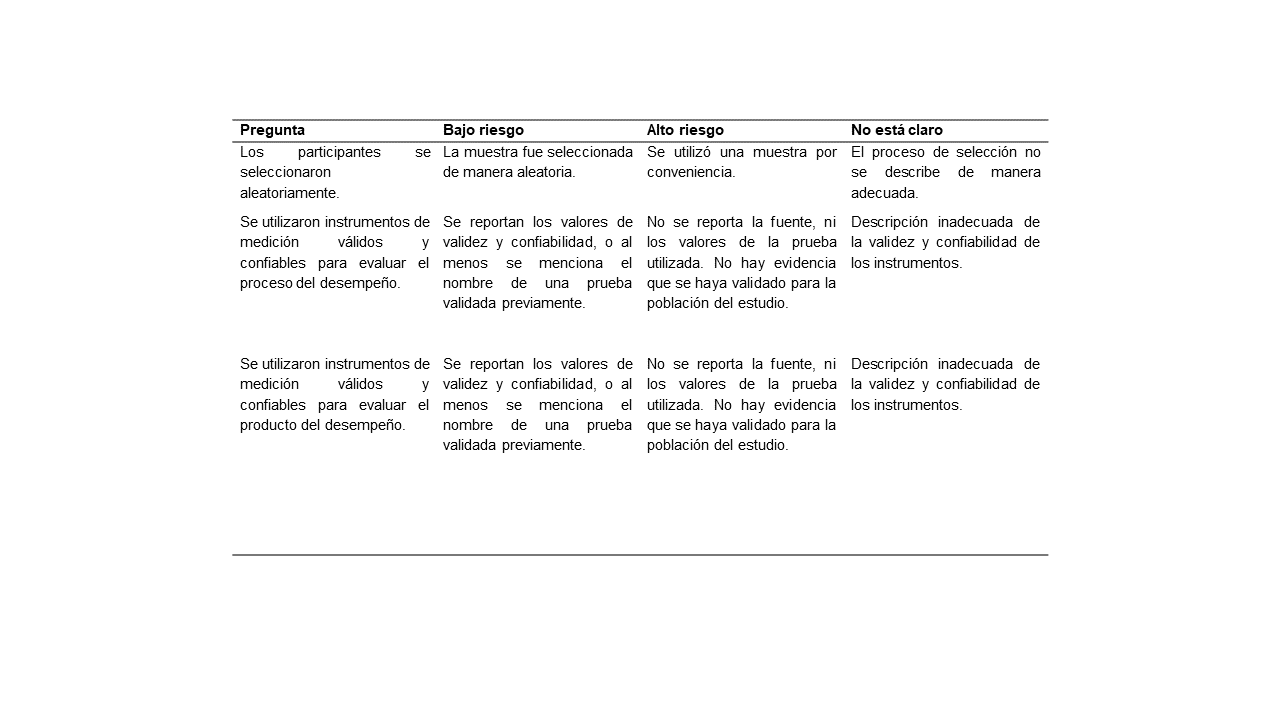 Para evaluar la calidad de los estudios incluidos se utilizó una escala construida por parte de las investigadoras que evalúa el riesgo al sesgo, por medio de tres preguntas (Tabla 1). Se coloca un signo de check (√) para bajo riesgo, una equis (x) para alto riesgo, y un signo de interrogación (?) cuando la información no está clara. Para realizar un análisis objetivo, se otorgaron 3 puntos a bajo riesgo, 2 puntos cuando la información no está clara y 1 punto en alto riesgo, para obtener un puntaje total máximo de 9 puntos. La calidad de los estudios se analizó como variable moderadora con el objetivo de identificar si la calidad de estos modera el efecto encontrado.