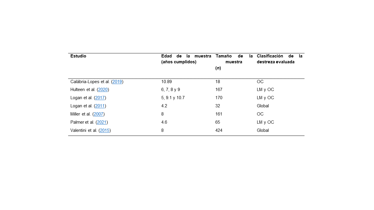 Los criterios de elegibilidad establecidos a priori incluyen: estudios con población infantil y/o adolescente, los cuales pueden presentar un desarrollo motor típico o atípico. Además, el estudio debe haber evaluado el desarrollo motor real por medio de proceso y producto y reportar la relación entre ambas mediciones (por medio del coeficiente de correlación). Por último, debe indicar la cantidad de participantes (estos últimos dos criterios son necesarios para calcular el tamaño de efecto). Además, los artículos deben estar publicados en una revista con revisión por pares, en idioma inglés, español o portugués. No se excluyó ningún estudio por año de publicación.