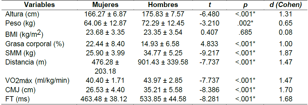 La Tabla 1 muestra las diferencias entre hombres y mujeres en las variables analizadas, excepto el IMC. Los hombres tenían una mayor altura y peso corporal que las mujeres. El porcentaje de grasa corporal es mayor en las mujeres, mientras que la masa músculo-esquelética es mayor en los hombres. En las pruebas de capacidades físicas, los varones mostraron mayores resultados en la distancia recorrida en la prueba de Yo-Yo y el VO2máx, así como en la altura y el tiempo de vuelo del CMJ.
