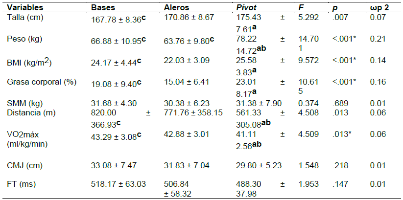 Teniendo en cuenta las diferencias encontradas entre las posiciones de juego en este estudio, los pívots tenían un mayor IMC y porcentaje de grasa corporal en comparación con los aleros y los bases. Los jugadores más altos eran los pívots. Estos datos coinciden con lo encontrado en jugadores de baloncesto masculinos jóvenes de élite (edad: 14.0 ± 0.3) y adultos profesionales (edad: 24.4 ± 5.4) de clubes polacos (Gryko et al., 2018). Los jugadores base son más mesomórficos en comparación con los pívots, aunque estos últimos tienen una mayor masa libre de grasa, mientras que los aleros tienden a ser más delgados, aunque más bajos (Ziv y Lidor, 2009).