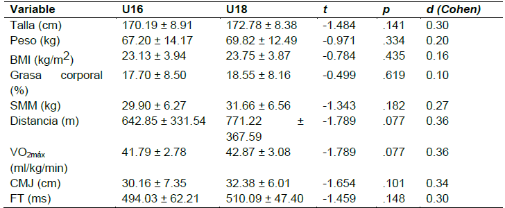 En cuanto a las comparaciones entre las categorías U16 y U18, no se encontraron significativas en ninguna de las variables analizadas. Los datos se pueden ver en la Tabla 3.