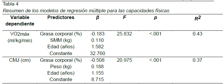 Los análisis de regresión múltiple mostraron que el porcentaje de grasa corporal, la masa músculo-esquelética y la edad predijeron significativamente el 43% (R2= 0.43) del VO2máx. Asimismo, el peso corporal, la masa músculo-esquelética y la edad predijeron el 37% (R2= 0.37) del rendimiento en el test CMJ (ver Tabla 4).