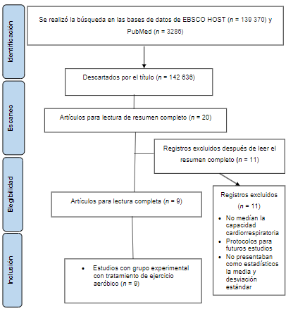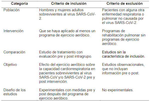 Se utilizaron los criterios PICOS (participants, intervention, comparators, study outcomes, and study design), por sus siglas en inglés (Liberati et al., 2009). Por tanto, entre los criterios de inclusión se estableció: estudios experimentales con mediciones pre y post, con la implementación de un programa de ejercicio aeróbico (ver Tabla 1). También, los participantes en los estudios debían ser hombres y mujeres sobrevivientes de la enfermedad del virus SARS-CoV-2