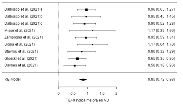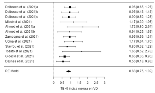 Se encontró (Tabla 3) un tamaño de efecto global de magnitud grande (según Cohen, 1988), positivo (indica mejora de pre a post) y distinto de cero, con 95% de confianza, atribuible al ejercicio con componente aeróbico (TE = 0.884; IC95%: 0.749 - 1.018). Este resultado indica beneficios del ejercicio en la capacidad cardiorrespiratoria en sobrevivientes de la enfermedad COVID-19. El componente presente en todas las intervenciones fue el aeróbico (Tabla 2), pero solo dos estudios (Ahmed et al., 2021; Missé et al., 2021) lo aplicaron exclusivamente, mientras que los otros siete combinaron el componente aeróbico y de fuerza en sus intervenciones, además de incluir trabajos de flexibilidad entre otros aspectos.