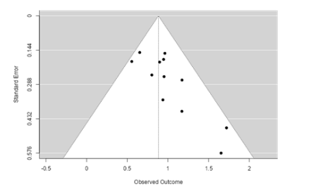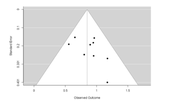 De acuerdo con el meta-análisis, hay evidencia de que el ejercicio con componente aeróbico tiene el efecto de mejorar la capacidad cardiorrespiratoria en personas sobrevivientes de COVID-19; sin embargo, en primera instancia se identificó evidencia de sesgo de publicación (prueba de Egger, p = 0.015). Por ejemplo, en la Figura 2 se muestra que el estudio de Ahmed et al. (2021) y el de Tozato et al. (2021) presentaban tamaños de efecto extremos, siendo bajo el peso de su aporte al ajuste del modelo. Por tal razón, se decidió corregir el modelo meta-analítico eliminando los datos de esos estudios que, además, presentaban alta variabilidad. Así, se obtuvo un modelo robusto con 9 tamaños de efecto (7 estudios) manteniendo un efecto global de magnitud grande y distinto de cero con 95% de confianza y sin evidencia de sesgo de publicación, de acuerdo con la prueba de Egger (ver Tabla 3) y gráfico de embudo (ver Figura 5) y sin evidencia de heterogeneidad (I2 = 0.87%). Por tanto, los estudios meta-analizados son bastante homogéneos y no se aprecia evidencia de alguna posible variable moderadora que explique estos resultados.