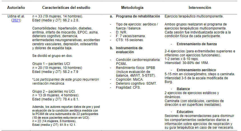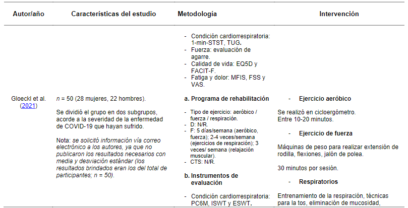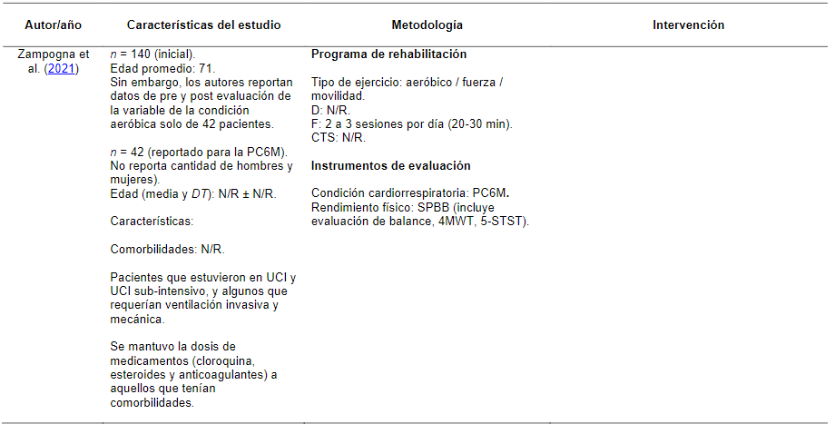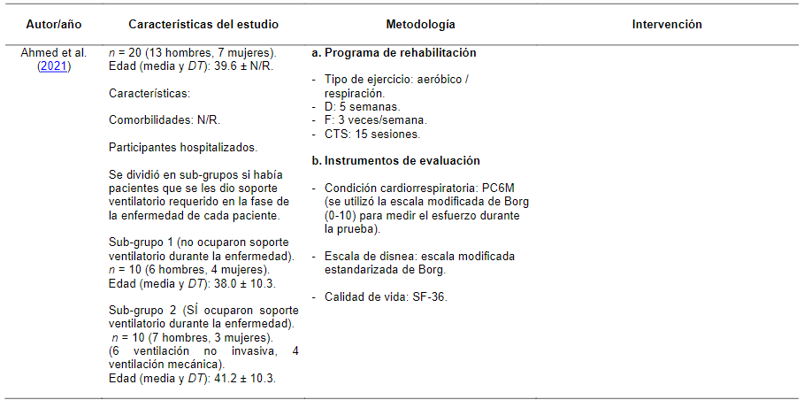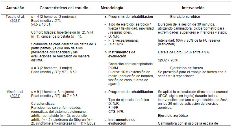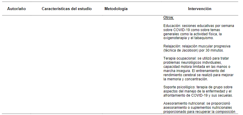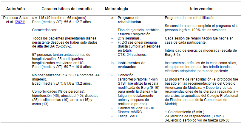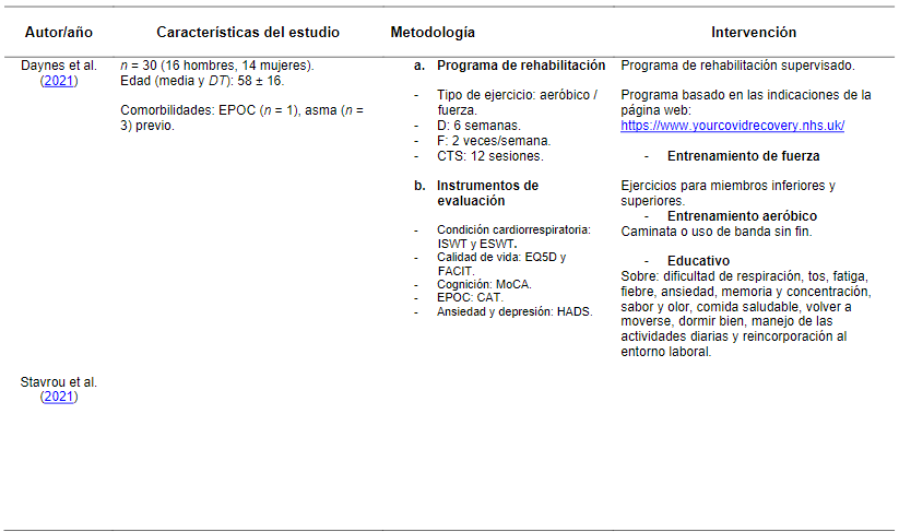 El inicio de la pandemia motivó varios estudios y se publicaron algunas revisiones sistemáticas, como la revisión de sombrilla de Suso-Martí et al. (2021) sobre la efectividad de la tele rehabilitación, o la revisión rápida de métodos de rehabilitación del COVID-19 de Ceravolo et al. (2020), quienes señalan la importancia de incluir en estos programas de ejercicio físico. Otras revisiones sistemáticas planteadas por Alawna et al. (2020), Thoguluva et al. (2021) y Misra et al. (2020) sugieren el uso de ejercicio aeróbico, diversos tratamientos y modalidades como recomendación para pacientes con la enfermedad.
