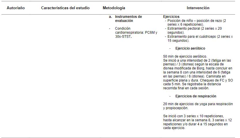Tipo de ejercicio: aeróbico, aeróbico combinado con fuerza, aeróbico combinado con fuerza en conjunto con terapia respiratoria y flexibilidad.