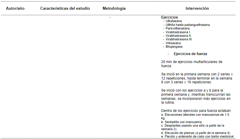 También, se excluyó el criterio 5 (cegamiento del evaluador) que tendría importancia en un escenario con un grupo control y otro de intervención, donde este cegamiento aplicaría para que, al medir, se desconozca cuáles participantes hacen ejercicio y cuáles no, controlando un posible sesgo por trato diferenciado de los participantes o de sus datos. Sin embargo, cuando se tiene un solo grupo de intervención (como sucedió en los estudios meta-analizados) este criterio no es posible que se cumpla.