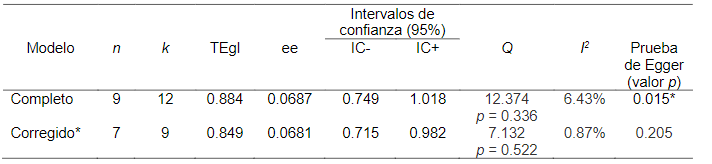 Se calcularon los tamaños de efecto (TE) intragrupo [(media post - media pre) /desviación estándar pre], aplicando el modelo de efectos aleatorios de máxima verosimilitud restringida, mediante el paquete estadístico Jamovi versión 2.2.5 (módulo MAJOR). Como parte de los análisis requeridos, se estimaron estadísticos de sesgo de publicación (prueba de Egger) y estadísticos de heterogeneidad (Q e I2).