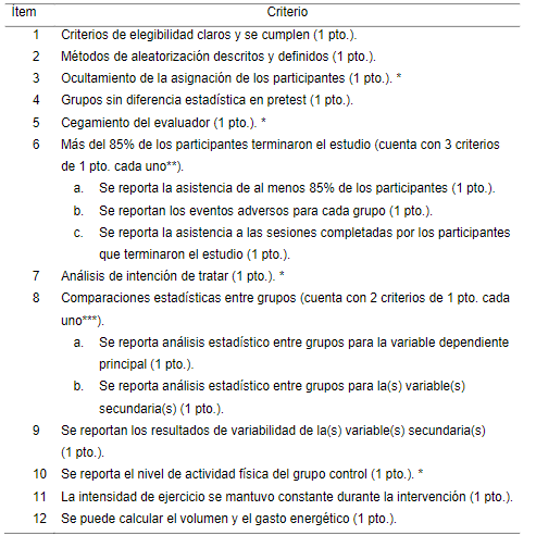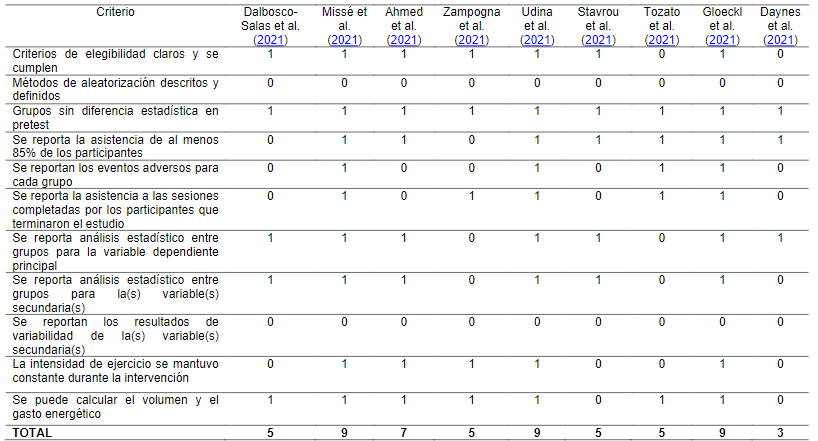 Por último, el criterio 10 (¿reporta el estudio el nivel de actividad física del grupo control?) fue excluido porque ninguno de los estudios meta-analizados reportó grupo control, por lo que el ítem no puede considerarse al haber solamente grupos experimentales. En la Tabla 5, se pueden observar los puntajes que obtuvo cada estudio.