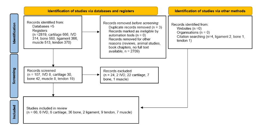 A total of 2819 records were identified (314 for intervertebral disc (IVD), 666 for cartilage, 561 for bone, 366 for ligament 513 for muscle and 370 for tendon). After full-text screening 66 records were included in the final analysis (6 for IVD, 6 for cartilage, 36 for bone, 2 for ligament, 9 for tendon and 7 for muscle). PRISMA flowchart is presented in Figure 1.León et al. (2023).