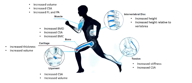 The most Reported outcomes for IVD were higher IVD in 5 studies and higher T2 values in 3 studies; for cartilage, an increase in thickness (2) and decrease in thickness (2); for bone there were increases in bone mineral density (BMD) (20), increases in bone mineral content (BMC) (10) and increases in cortical area (6); for ligament were increase in cross sectional area (CSA) (1) and increase in volume (1); for tendon there were increases in CSA (6), increases in stiffness (5); for muscle there were increases in mass (4) and increases in CSA (2).