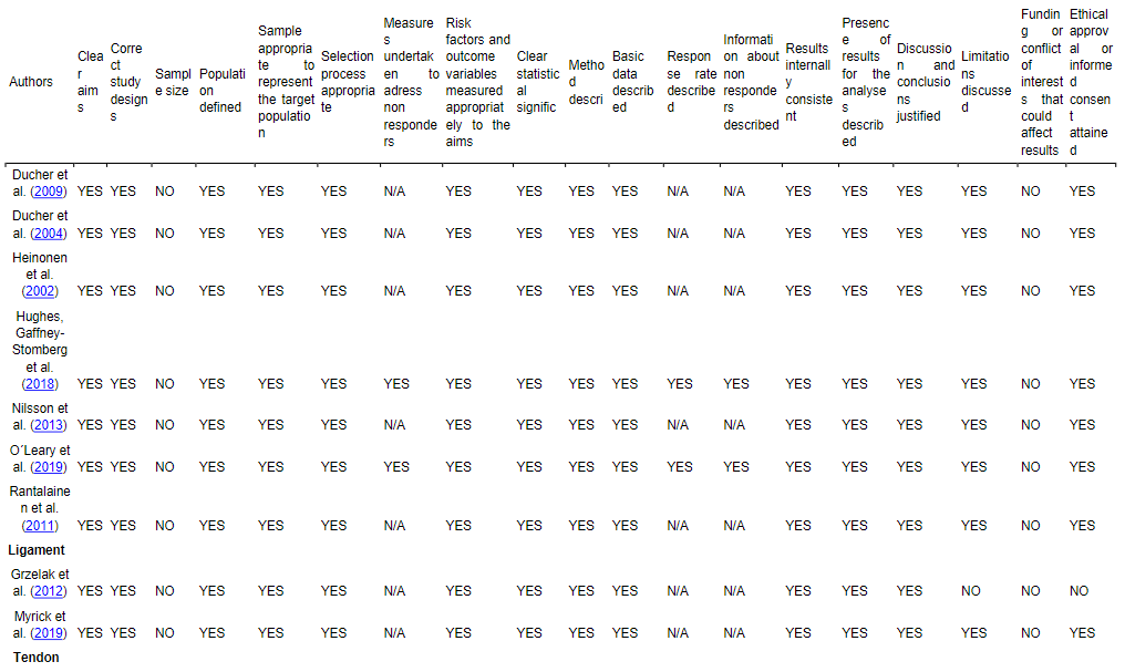 For tendon all criteria were met; three had measures undertaken to address non-responders, response rate described and information about non-responders (Karamanidis & Epro, 2020; Milgrom et al., 2014; Westh et al., 2007) and one had justified its sample size and no clear statistical significance (Milgrom et al., 2014).