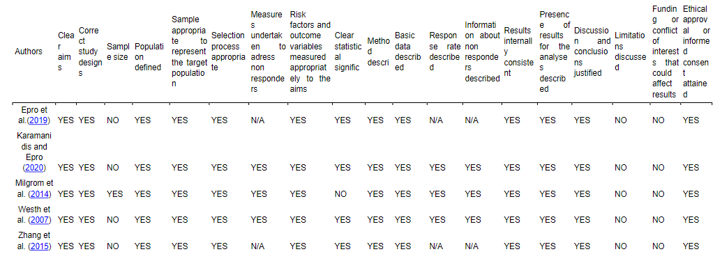 Downes, M. J., Brennan, M. L., Williams, H. C., & Dean, R. S. (2016). Development of a critical appraisal tool to assess the quality of cross-sectional studies (AXIS). BMJ Open, 6(12), e011458. http://dx.doi.org/10.1136/bmjopen-2016-011458
