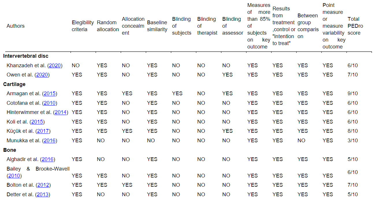 All the included studies regarding muscle and cartilage corresponded to experimental designs; therefore, no assessment for observational studies was performed.