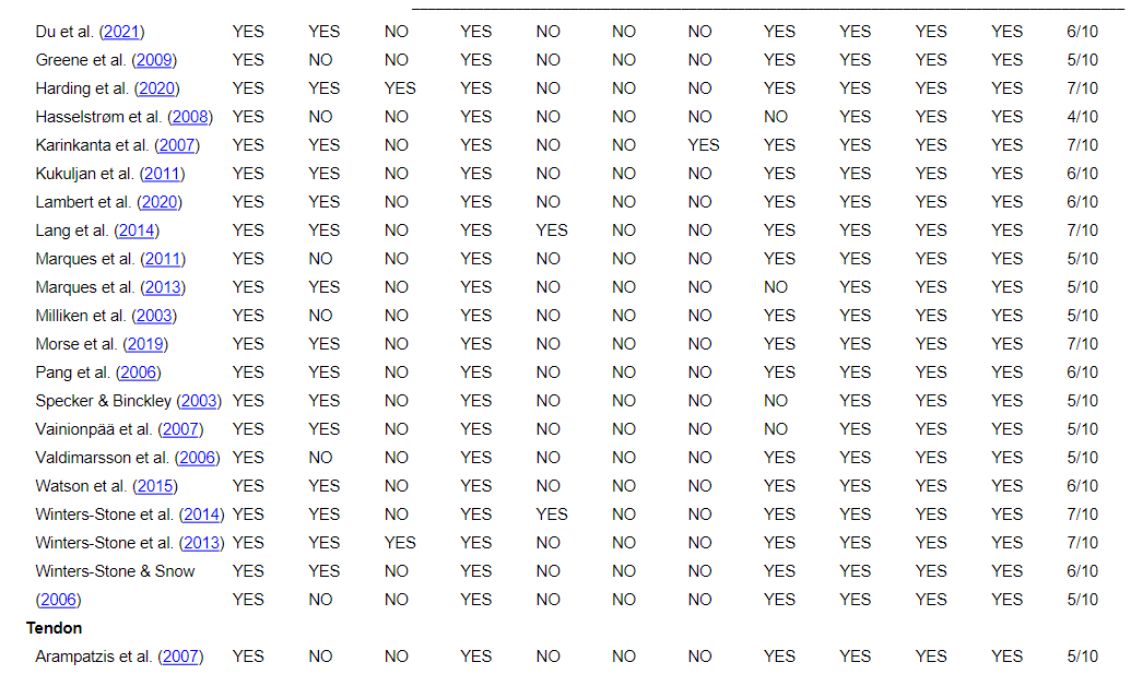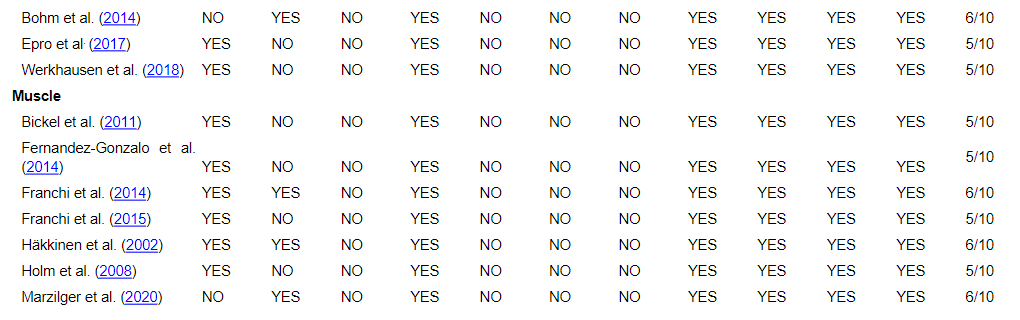 For muscle four had a score of 5/10 (Bickel et al., 2011; Fernandez-Gonzalo et al., 2014; Franchi et al., 2014; Holm et al., 2008), and three had a score of 6/10 (Franchi et al., 2015; Häkkinen et al., 2002; Marzilger et al., 2020).