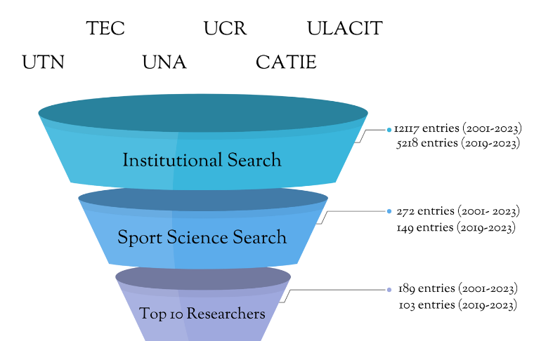 All information search was conducted on April 18th, 2023, using the advanced search platform of Web of Science (Clarivate). The initial search was made for institutions in Costa Rica included in this digital platform (e.g., UCR, UNA, CATIE, ULACIT, UNED, UTN, TEC). Once the data was refined by institutions, it was filtered according to sport science category (Web of Science category). Due the Web of Science platform sometimes included collaborator authors as members of the universities the final filtering based on top 10 researchers in sport science was performed manually. Each of the entries found when performing the filtering process is presented in Figure 1. For the required analyses, bibliometric information was analysed using the Web of Science tool (e.g., analyze results). The Web of Science categories assign each published paper to a category based on the journal the manuscript was published. Each manuscript is assigned to only one category of the Web of Science Core Collection.