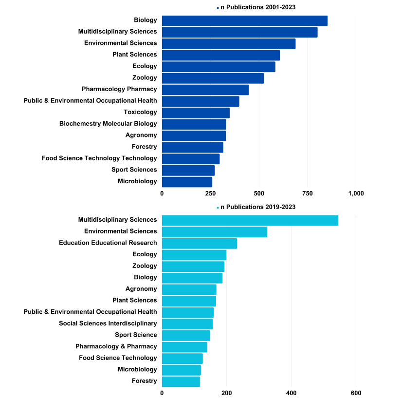 Since 2001, human movement sciences have been ranked within the top 16 research areas according to statistics from the Web of Science platform. The exponential growth of publications in this field is evident in the increase of publications in the last five years and the rise to the top 11 areas with the most publications in Costa Rica. Only from 2019 to present, 54.78% of the total publications available since 2001 in the field of sports science have been published. Additionally, this area has moved up from the 14th position to the 11th position (see Figure 2).