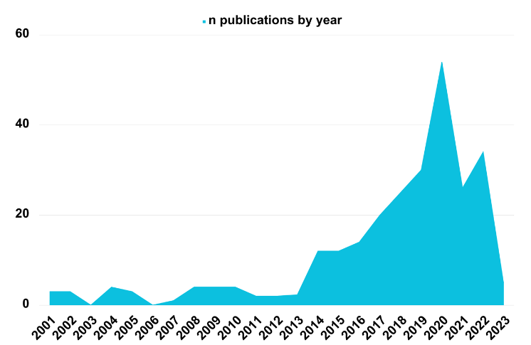 The growth of HMS research has been particularly pronounced over the last quinquennium, with more than half of the total publications available in the field since the year 2000 being published in the last five years alone (see Figure 3.). This remarkable increase in research output is evidence of the growing interest in the field, despite the fact that there is still a lack of resources and investment in HMS research.
