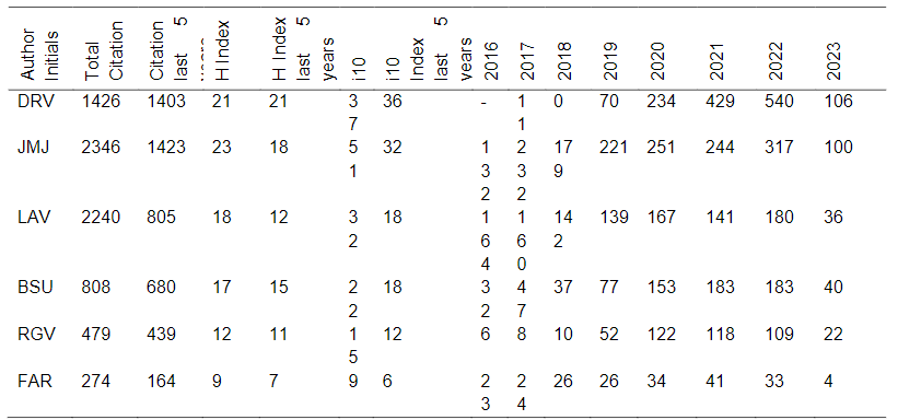 Citations based on Google Scholar data are frequently used as a benchmark for the calibre of research in human movement science. Citations show that other researchers valued the study and utilized it as a source of inspiration for their own work. A study's high citation count indicates that it has made a substantial contribution to the area and that other experts hold it in high esteem (Teixeira da Silva, 2021). The top five HMS researchers in Costa Rica are cited more and more frequently, as seen in Table 1. High citation index and worldwide research collaboration have a beneficial association. Collaboration among academics from various institutions and nations can result in more information sharing, fresh perspectives, and better research outputs.
