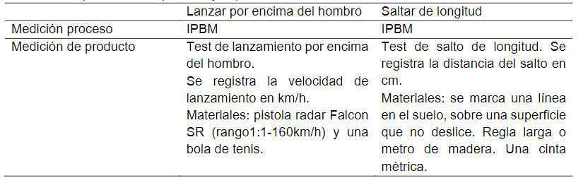 Para medir el producto, en saltar, se realizó la prueba de salto de longitud y, en lanzar, se realizó la prueba de lanzamiento por encima del hombro (Tabla 1). Ambas se describen a continuación: