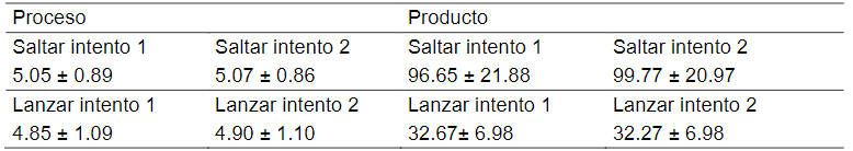 La varianza explicada señala que, en saltar, el 20% y el 31% (intento 1 y 2 respectivamente) y en lanzar, el 1.1% y el 9.7% (intento 1 y 2 respectivamente) se deben a la relación entre la evaluación del producto y el resultado obtenido en la evaluación del proceso. La Tabla 2 muestra los valores promedios y las desviaciones típicas de los dos intentos en cada destreza.