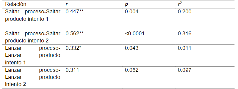 Las correlaciones obtenidas expusieron la existencia de una relación positiva y significativa entre la evaluación del proceso y la evaluación del producto de saltar en el intento 1 (r = 0.447; p = .004; r2 = 0.200) y en el intento 2 (r = 0.562; p < .0001; r2 = 0.316); de igual forma entre la evaluación del proceso y la evaluación del producto de lanzar en el intento 1 (r = 0.332; p = .043; r2= .011) y en el intento 2 (r = 0.311; p = .051, r2 = 0.097) (Tabla 3). En concreto, estos resultados reflejaron la existencia de correlación positiva, significativa entre la evaluación del proceso y la evaluación de producto en cada patrón y entre los intentos.