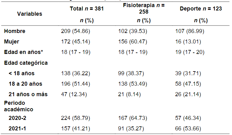 El tipo de muestreo fue de carácter no probabilístico y se utilizó una muestra por conveniencia. Participaron 381 estudiantes de primer semestre de las carreras de fisioterapia (n = 258) y profesional en deporte (n = 123) de la Institución Universitaria Escuela Nacional del Deporte de Cali, Colombia, en los periodos 2020-2 y 2021-1. El 54.9% del total de los participantes eran hombres y el 45.1% eran mujeres; el 36.2% tenían menos de 18 años y 51.4% tenían entre 18 y 20 años. En el programa de fisioterapia, el 60.47% eran mujeres, mientras que en el programa de profesional en deporte el 87% eran hombres. Como criterio de inclusión, se determinó estar debidamente matriculado en el primer semestre del programa académico correspondiente.