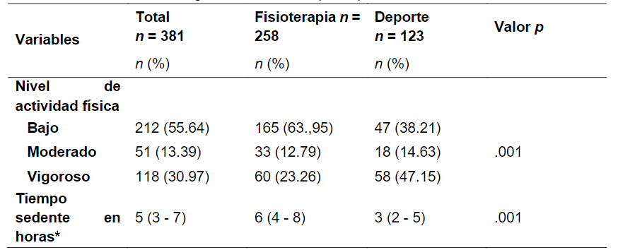 En relación con el nivel de actividad física autorreportado con el IPAQ, tal como se evidencia en la Tabla 2, el 63.95% de los estudiantes de primer semestre de fisioterapia realizaron un bajo nivel actividad física; mientras que, en el programa de profesional en deporte, el 47.15% de los estudiantes reportó niveles de actividad física vigorosa. Asimismo, se presentaron diferencias estadísticamente significativas en cuanto al número de horas en posición sedente entre ambos grupos (p = .001), donde el grupo de fisioterapia estuvo más tiempo sentado comparado con el grupo de deporte.