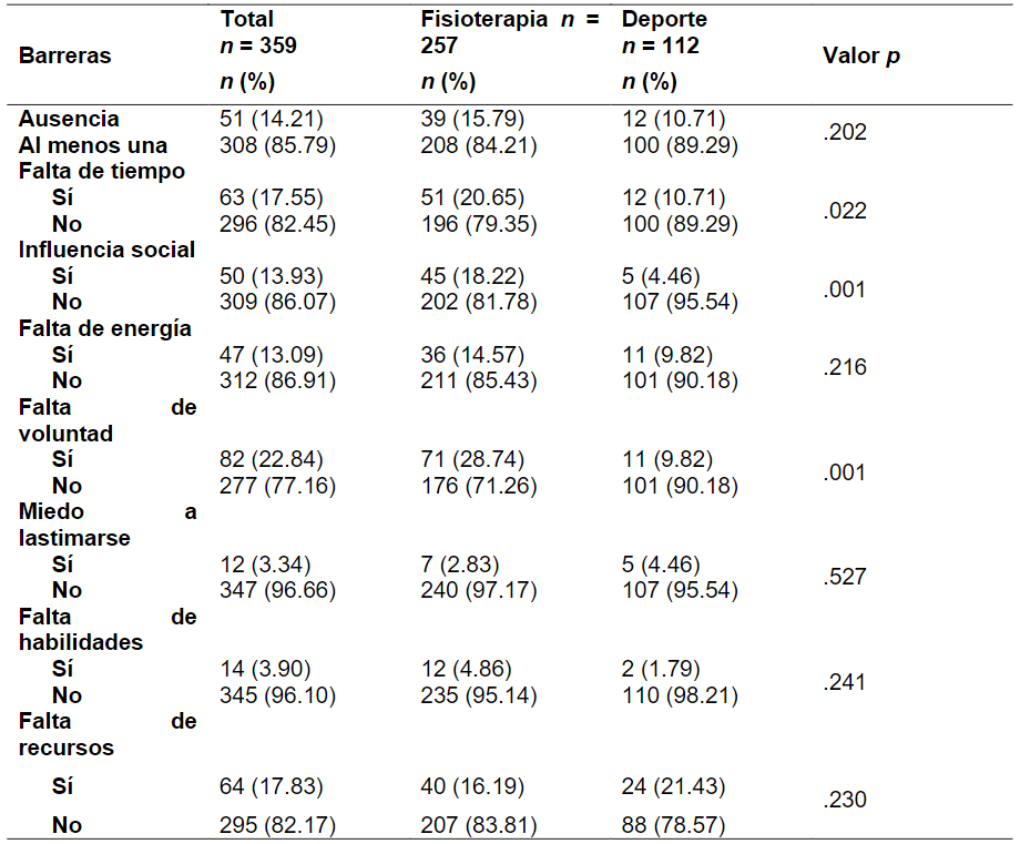 Respecto a las barreras para realizar actividad física, según lo evidencia la Tabla 3, el 85.79% de los estudiantes reportaron al menos una barrera. Un mayor porcentaje de estudiantes de fisioterapia reportó la presencia de todos los tipos de barreras, comparado con el grupo de profesionales en deporte, con diferencias estadísticamente significativas para las barreras: falta de tiempo (20.65% vs. 10.71%; p = .022), falta de voluntad (28.74% vs. 9.82%; p = .001) e influencia social (18.22% vs 4.46%; p = .001).