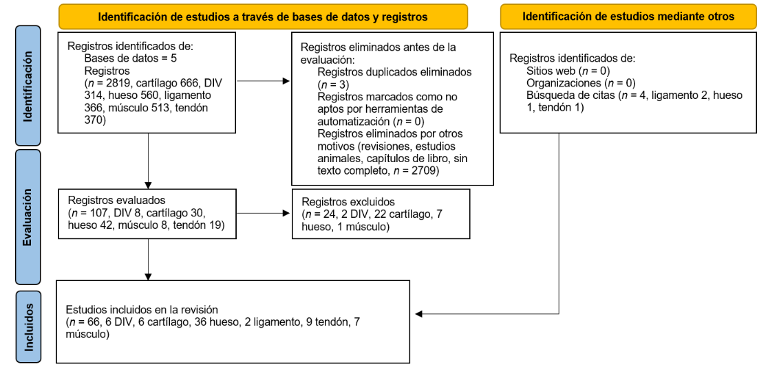 En total, se identificaron 2819 registros (314 para disco intervertebral (DIV), 666 para cartílago, 561 para hueso, 366 para ligamento 513 para músculo y 370 para tendón). Tras el análisis de texto completo, se incluyeron 66 registros en el análisis final (6 para DIV, 6 para cartílago, 36 para hueso, 2 para ligamento, 9 para tendón y 7 para músculo). El diagrama de flujo PRISMA se presenta en la Figura 1 (León et al., 2023).