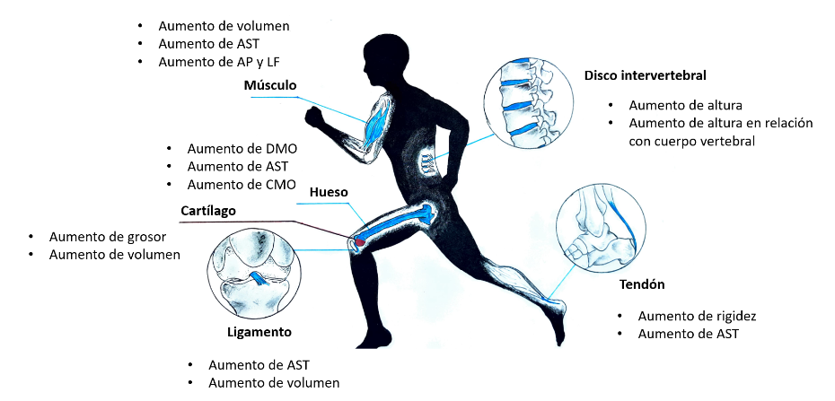 Los resultados más notificados para el DIV fueron un mayor DIV en 5 estudios y valores de T2 más altos en 3 estudios; para el cartílago, un aumento del grosor (2) y una disminución del grosor (2); para el hueso hubo aumentos de la densidad mineral ósea (DMO) (20), aumentos del contenido mineral óseo (CMO) (10) y aumentos del área cortical (6); en el ligamento, aumento del área de la sección transversal (AST) (1) y aumento del volumen (1); en el tendón, aumento del AST (6) y aumento de la rigidez (5); en el músculo, aumento de la masa (4) y aumento del AST (2).
