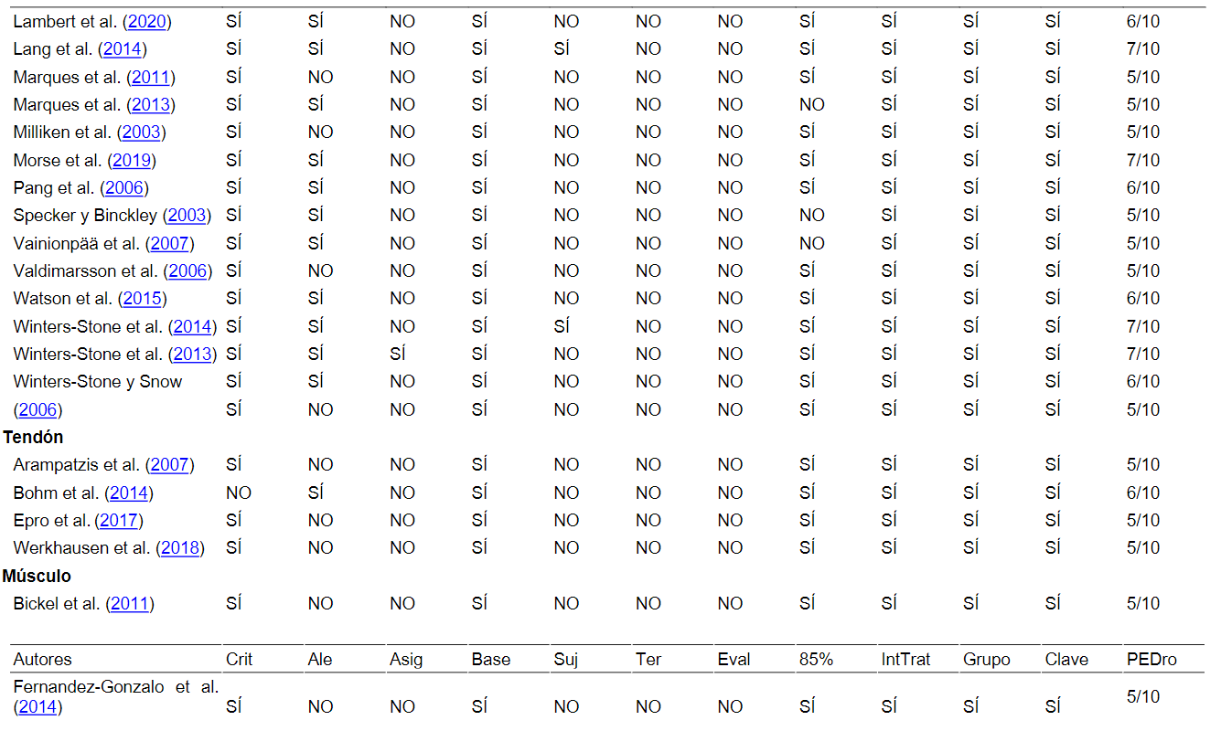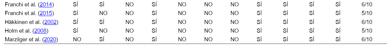 Para músculo, cuatro tuvieron un puntaje de 5/10 (Bickel et al., 2011; Fernandez-Gonzalo et al., 2014; Franchi et al., 2014; Holm et al., 2008) y tres tuvieron un puntaje de 6/10 (Franchi et al., 2015; Häkkinen et al., 2002; Marzilger et al., 2020).