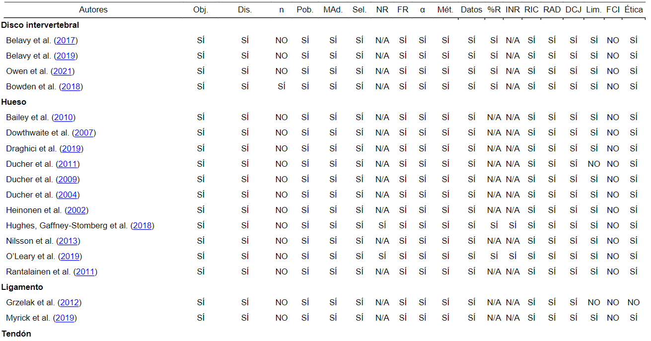 En el caso del DIV, cuatro estudios fueron observacionales y dos experimentales; en el del cartílago, los seis estudios fueron experimentales; en el del hueso, veinticinco estudios fueron experimentales y once observacionales; en el del ligamento, ambos estudios fueron observacionales; en el del tendón, cuatro fueron experimentales y cinco observacionales; y en el del músculo, los siete estudios fueron experimentales.