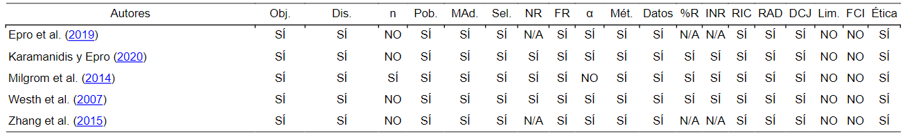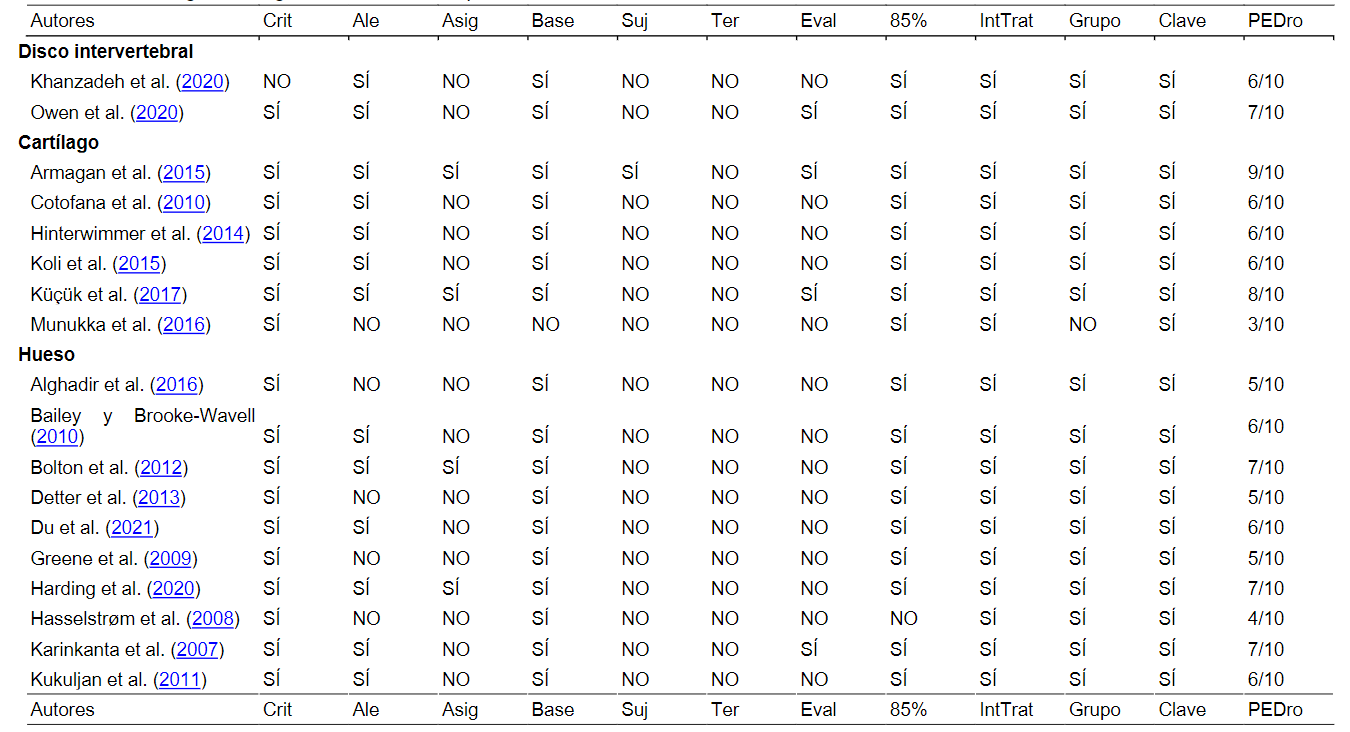 Los parámetros que no cumplieron la mayoría de los estudios fueron la ocultación de la asignación, el cegamiento de los sujetos, el cegamiento de los terapeutas y el cegamiento de los evaluadores. Los estudios incluidos para el tejido ligamento correspondían a un diseño observacional; por lo tanto, no se realizó una evaluación de los estudios experimentales.