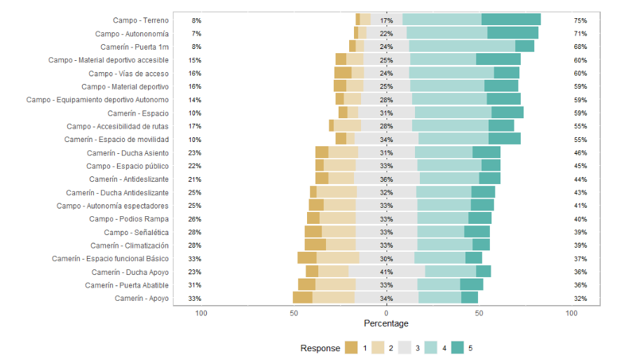 El primer objetivo de la investigación era fundamentalmente descriptivo. Debido a ello, se comenzó por caracterizar la muestra en términos de su edad (media y desviación típica) y las frecuencias de género, discapacidad, nivel competitivo y AANA. Teniendo esto en cuenta, se procedió a una caracterización del perfil de respuesta a la encuesta. Para ello, se generaron gráficos indicando los porcentajes por puntuación Likert de las respuestas obtenidas en cada pregunta. Las preguntas se ordenaron gráficamente desde las de mejor percepción hasta las de peor percepción y se agruparon para una mejor comprensión de dónde se encontraban los dominios del transporte, ubicación cancha deportiva, estacionamientos y baños y vestuarios. El proceso se realizó mediante la metodología del Coeficiente de Validez de Contenido (CVC) que, según Hernández-Nieto (2013), permite evaluar el grado de acuerdo de los expertos respecto a cada uno de los ítems y al instrumento en general (Pedrosa et al., 2013).